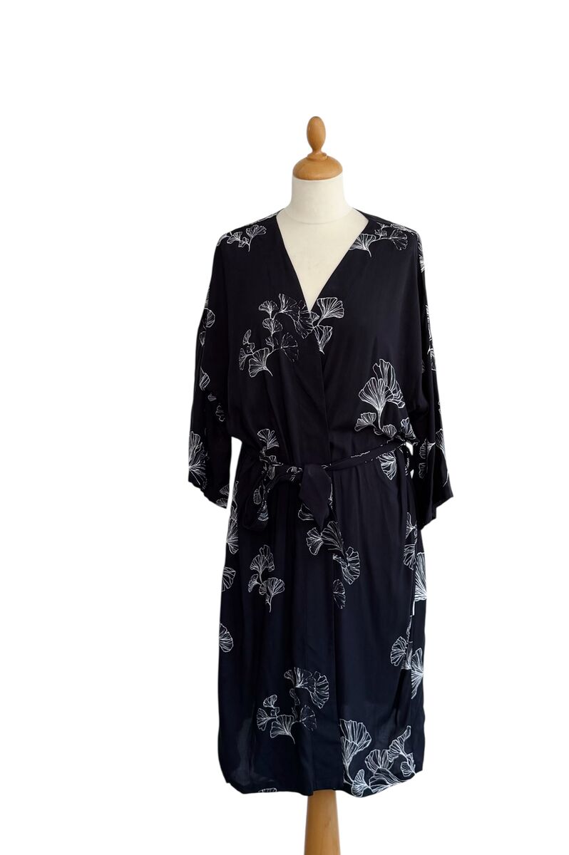 Mustavalkoinen Riva Clothing kimonotyylinen kietaisumekko koko S/M (kainalo-kainalo 60cm, olka-helma 103cm) sivuilla taskut, puolihihat, sisäpuolella vyötäröllä kiinteä solmunaru sekä lisäksi irroitettava nauhavyö | 100%ecovero viskoosi | kunto hyvä | 35€
